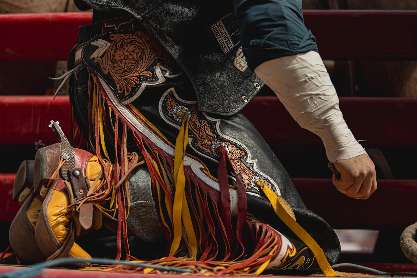 The equipment required by the saddle bronc competitor includes his own CPRA approved saddle, spurs with dull rowels (the revolving disk at the end of each spur), leather chaps and a braided rein. The length of the rein is crucial as it can mean the difference between staying on the bronc for the full eight seconds, or being tossed off. By adjusting his grip carefully, the cowboy can maintain his balance and, hopefully, prevent himself from being pulled out of the saddle and over the front end of the horse.
