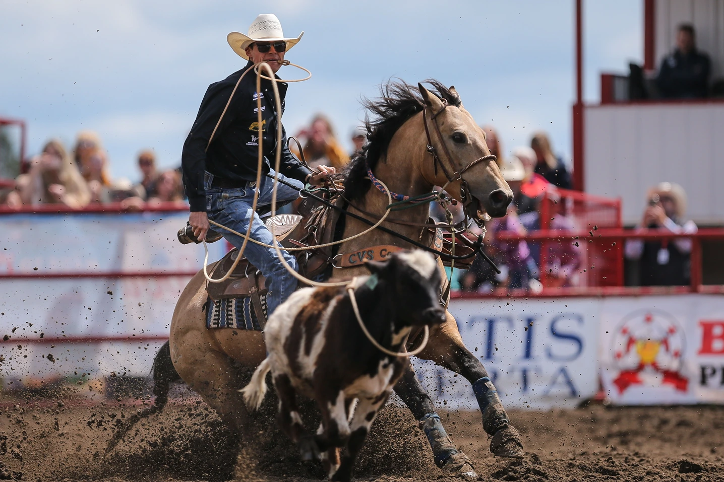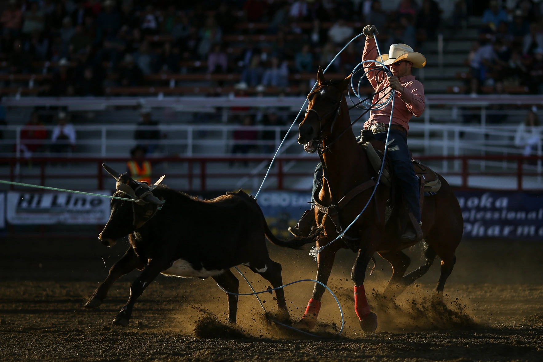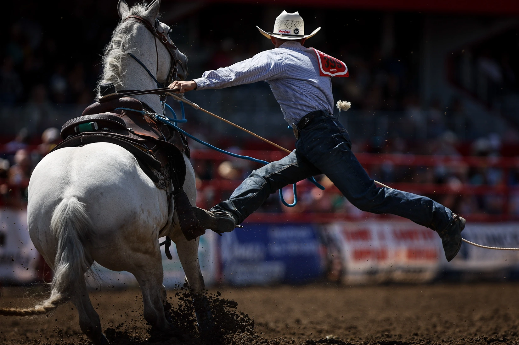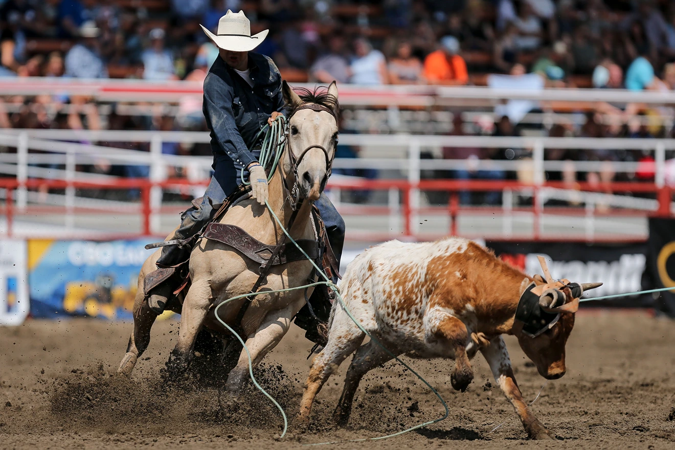 Once the header has caught the steer, he wraps the rope around the saddle horn (dallies) and turns left with the steer in tow. The heeler then ropes both hind legs of the steer and dallies his rope. Once the slack has been taken out of both ropes and the contestants are facing each other, the flag drops and time stops. If the heeler only catches one leg, a 5-second penalty is added. If the heeler throws his loop before the header has turned the steer left, that is called a “crossfire” and the run is disqualified.