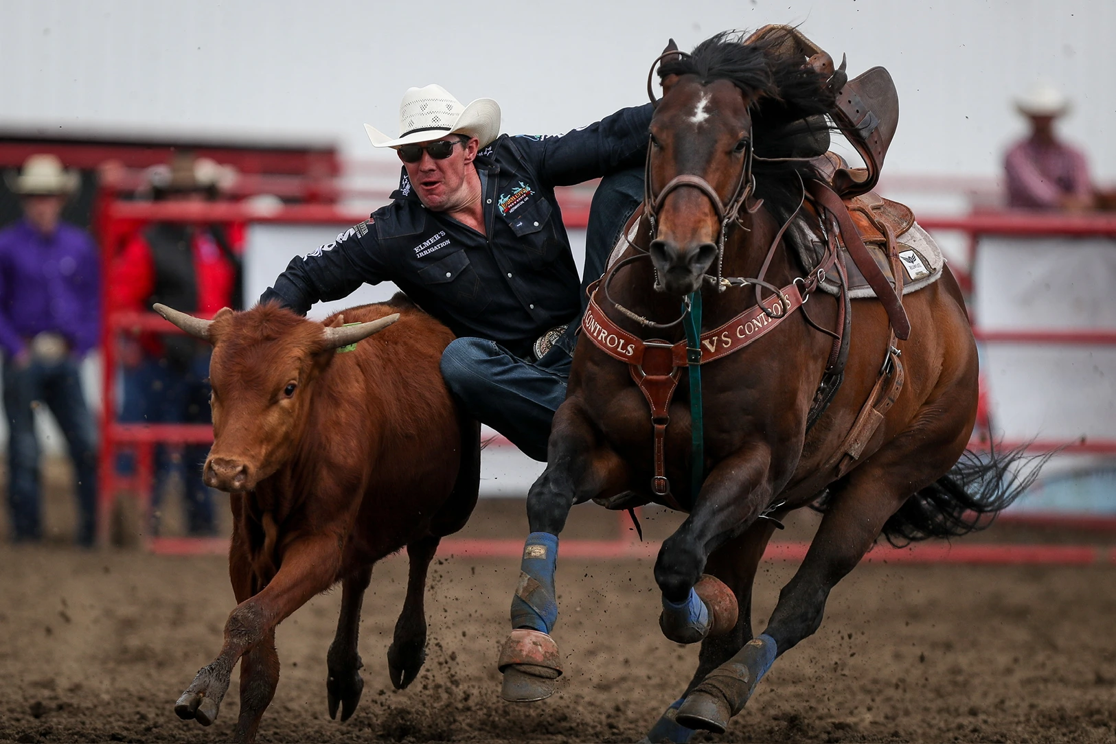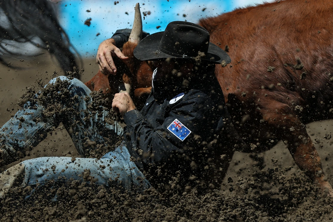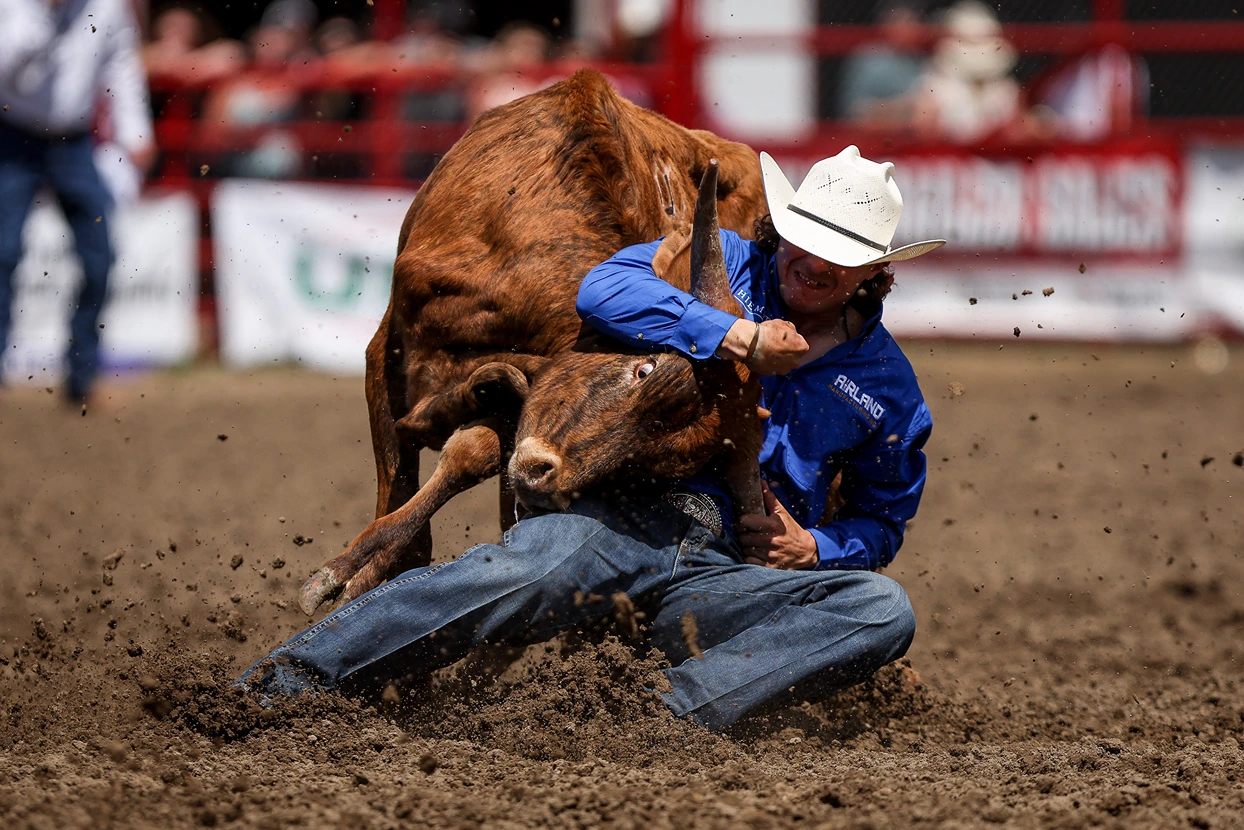 Coming out of the starting box, the horse runs alongside the steer and is trained to run on by as the steer wrestler reaches for his steer. With a firm grip on the steer’s right horn, the cowboy hits the ground with his legs extended forward, brings the steer to a dead stop and then using his left hand as leverage under the steer’s jaw, he throws the steer off balance and wrestles it to the ground. The steer must be flat on its side before official time is taken. This event requires an extra horse ridden by a hazer, whose job it is to keep the steer running as straight as possible.