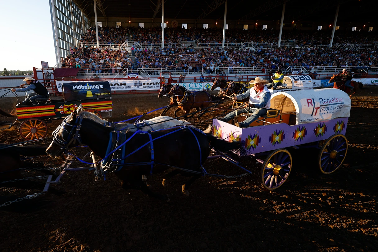 The action begins at 6:30pm with the All Pro Canadian Chuckwagons followed by the “Top Wagon Drivers in the World” of the World Professional Chuckwagon Association. Enjoy an evening packed with excitement as the four teams of four horses hitched to a chuckwagon race around our 5/8 mile track with outriders, thundering hooves and adrenaline overload in hopes to finish penalty free and have the fastest time of the night.